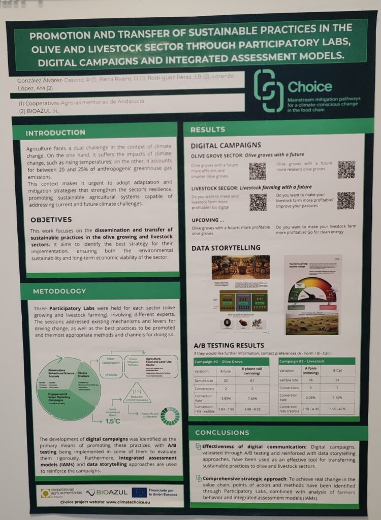 The poster highlighted the Spanish pilot and how CHOICE is supporting the uptake of more sustainable practices among farmers and livestock producers in Andalusia. It was designed to show the direction of the pilot, and underline how this knowledge is being shared with the sector. For that reason, it gave particular attention to digital campaigns, data storytelling and A/B testing as tools for communicating sustainable practices in a clearer and more engaging way.