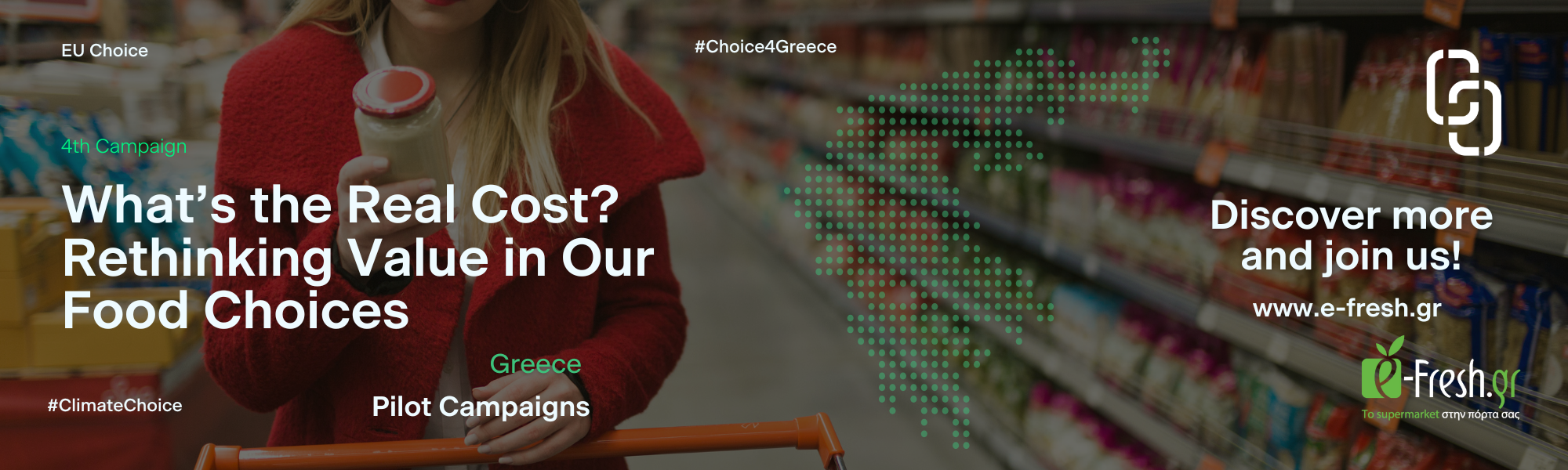 The third campaign of the Greek pilot, implemented by e‑Fresh.gr in collaboration with CHOICE, highlights the hidden climate impact of everyday grocery items—from plant-based drinks to meat alternatives and beyond. Building on the momentum of the previous campaigns, this phase expands the narrative beyond individual product categories to emphasize how habitual shopping behaviors shape our environmental footprint over time.